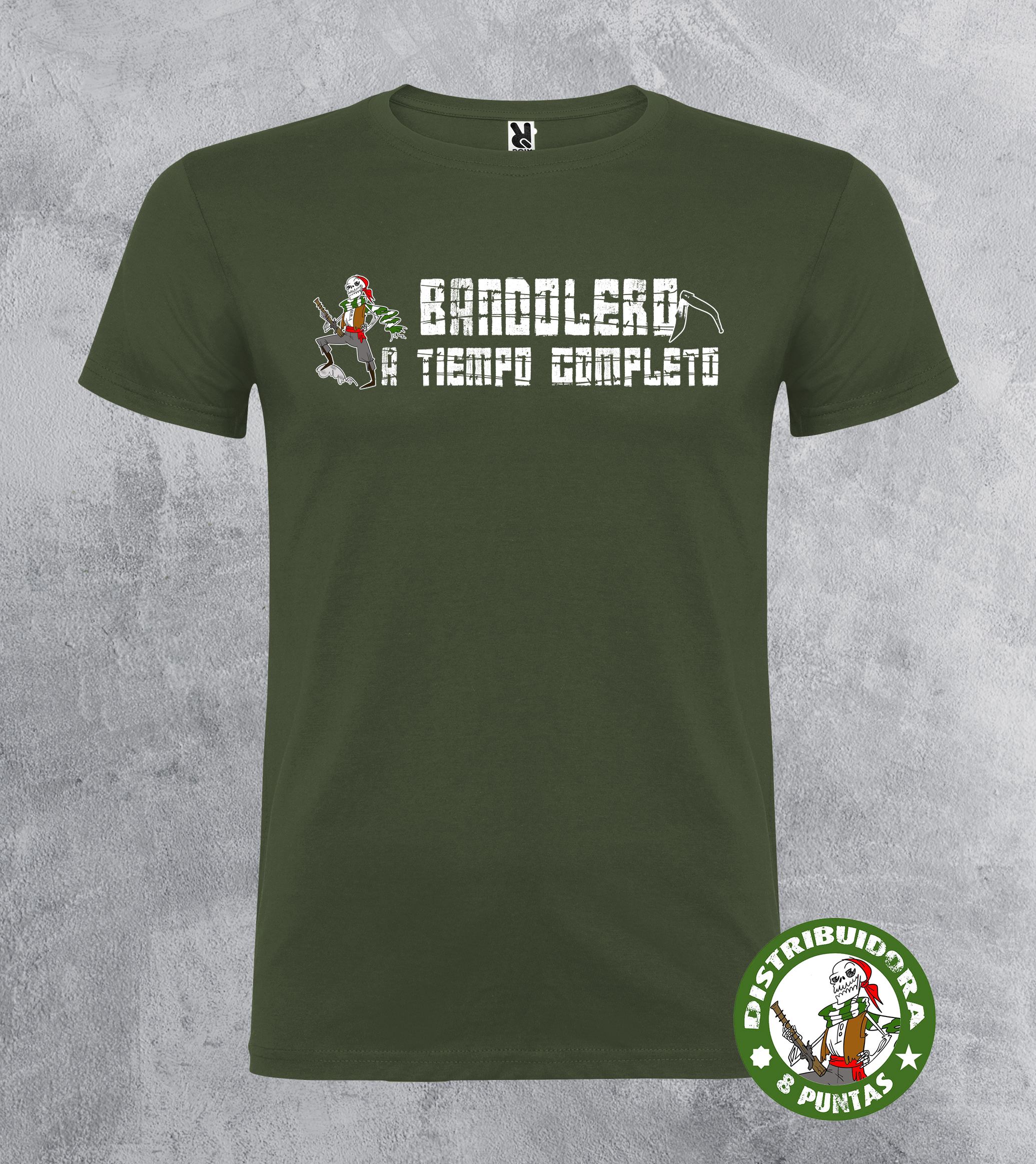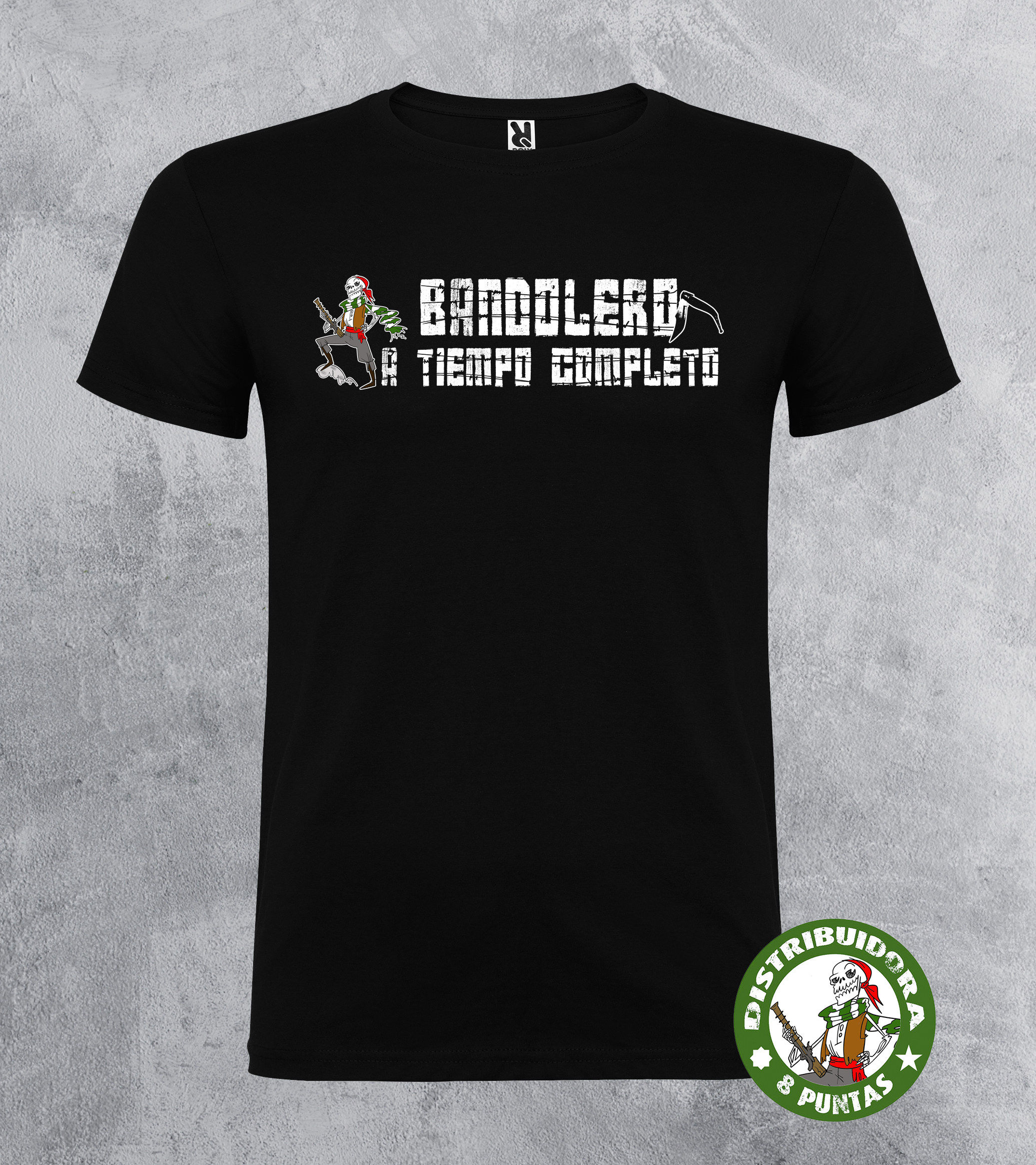 Camiseta unisex de manga corta. Camiseta andalucista y revolucionaria con el lema «BANDOLERO A TIEMPO COMPLETO» y la calavera bandolera de la Distri. Disponible en 12 colores. Tallas 4Xl en este modelo disponible en negro, rojo y verde omeya. Gramajes: 100% algodón, punto liso, 170 g/m² modelo estándar. 100% algodón, punto liso, 190 g/m² modelo premium.