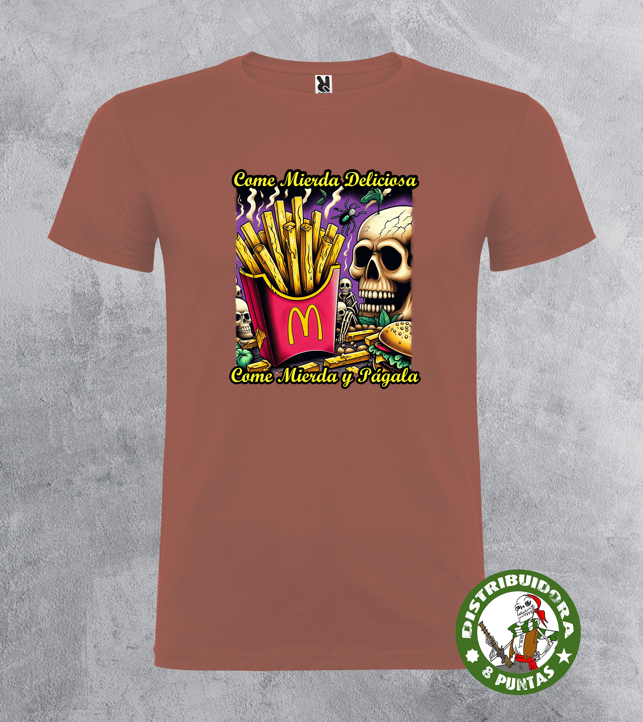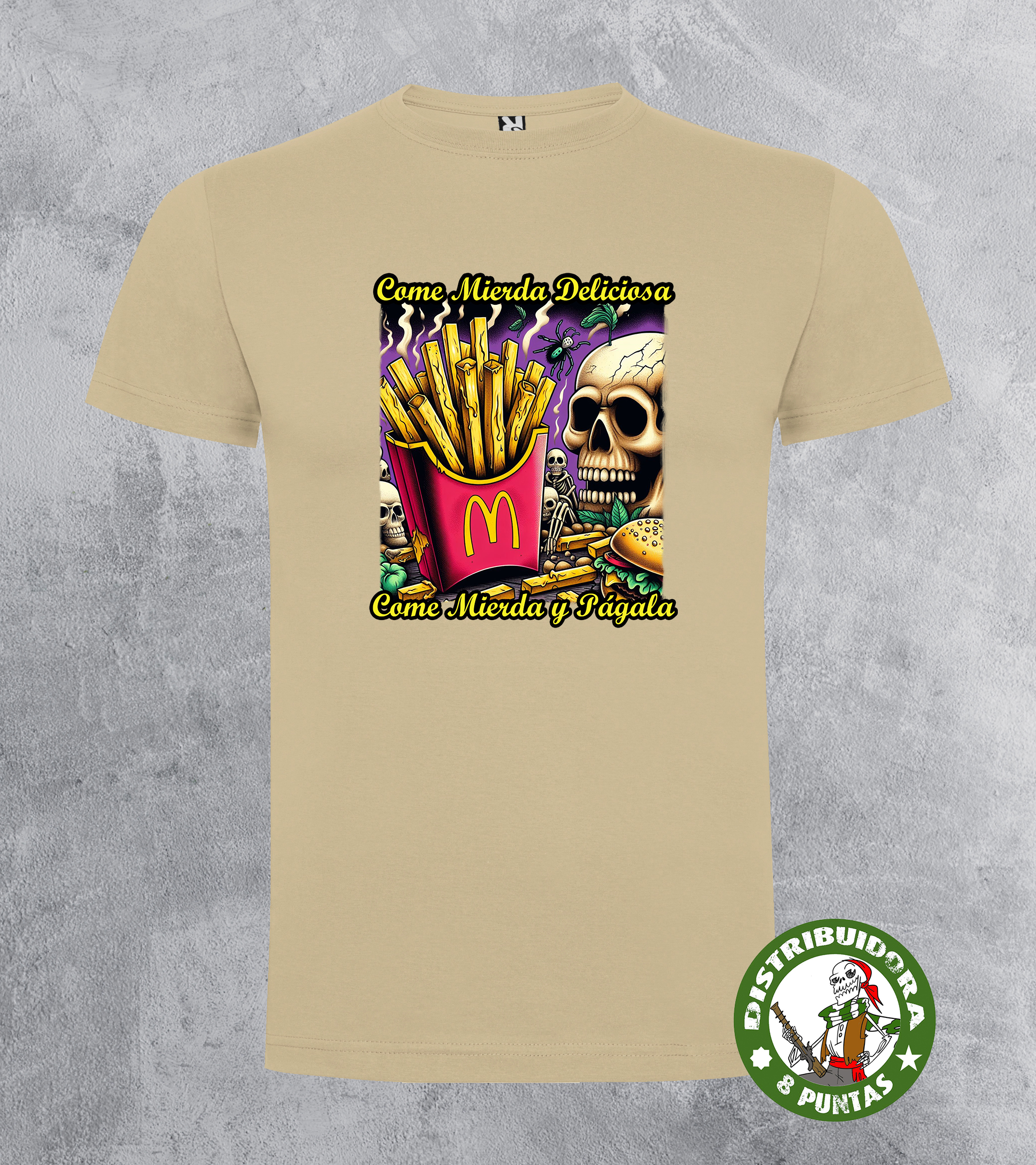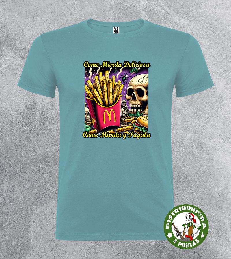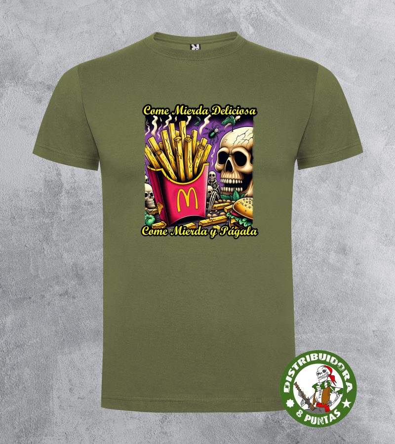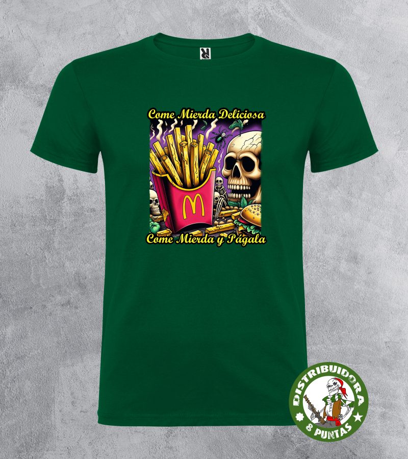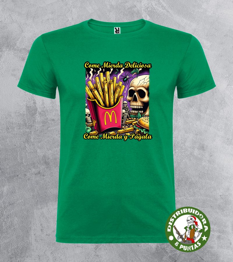 Camiseta unisex de manga corta. Camiseta andalucista y revolucionaria con una denuncia brutal sobre el veneno que venden las grandes marcas de comida rápida, basada en la conocida canción de La Polla Records «Come mierda». Disponible en 19 colores. Tallas 4Xl en este modelo disponible en negro, blanco, rojo y verde omeya. Gramajes: 100% algodón, punto liso, 170 g/m² modelo estándar. 100% algodón, punto liso, 190 g/m² modelo premium.
