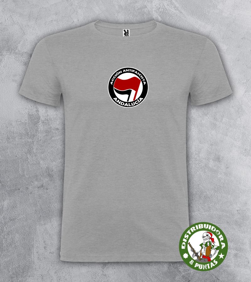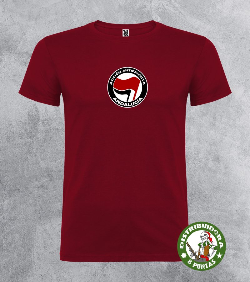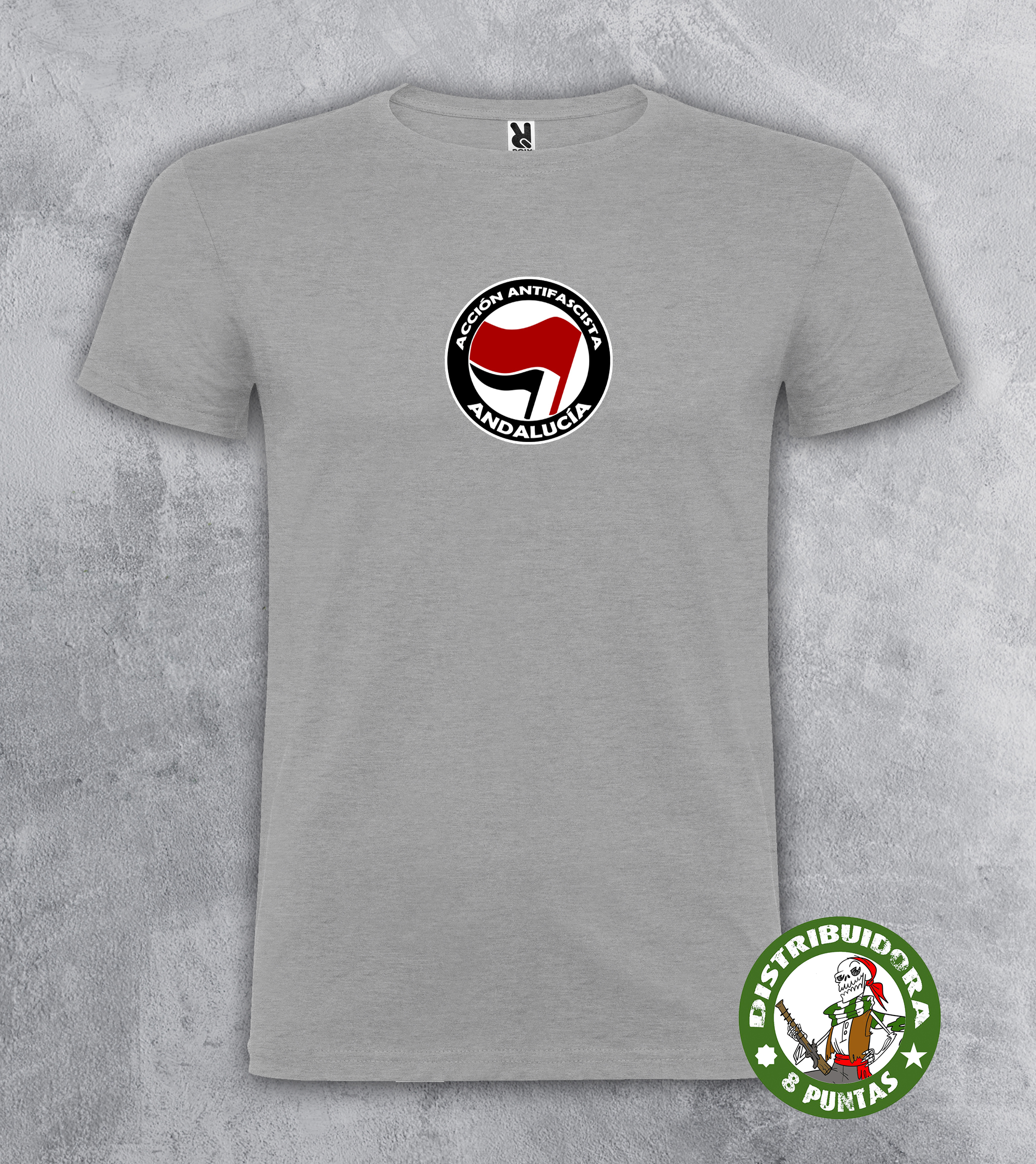 Camiseta de mujer de manga corta. Camiseta andalucista, revolucionaria y antirracista con el logo de Acción Antifascista Andalucía tamaño mediano en el pecho. Disponible en 5 colores. Gramajes: 100% algodón, punto liso, 170 g/m² modelo estándar. 100% algodón, punto liso, 190 g/m² modelo premium.