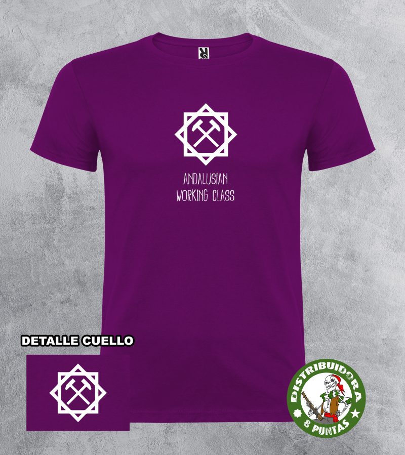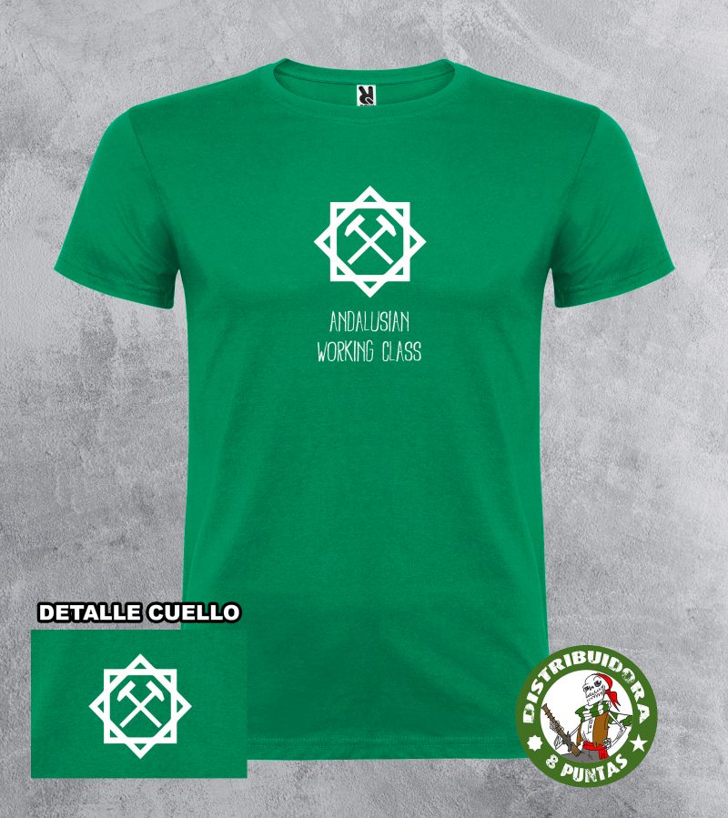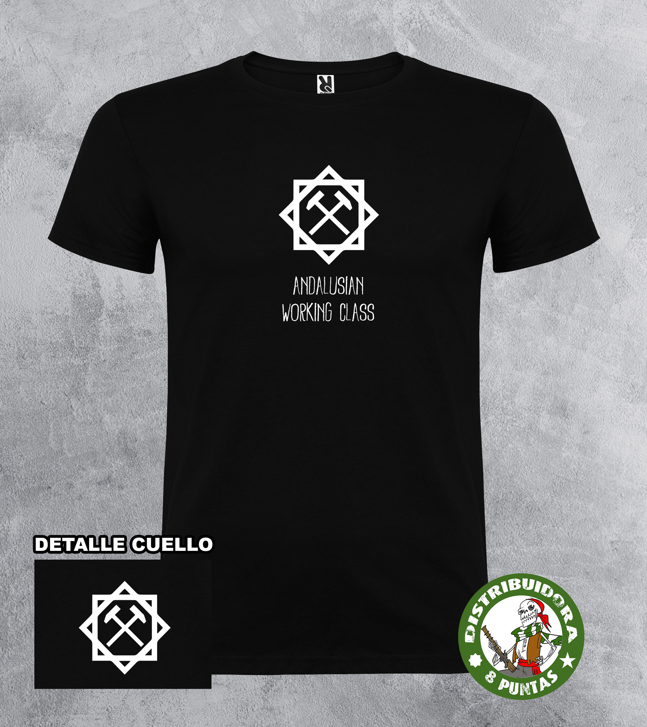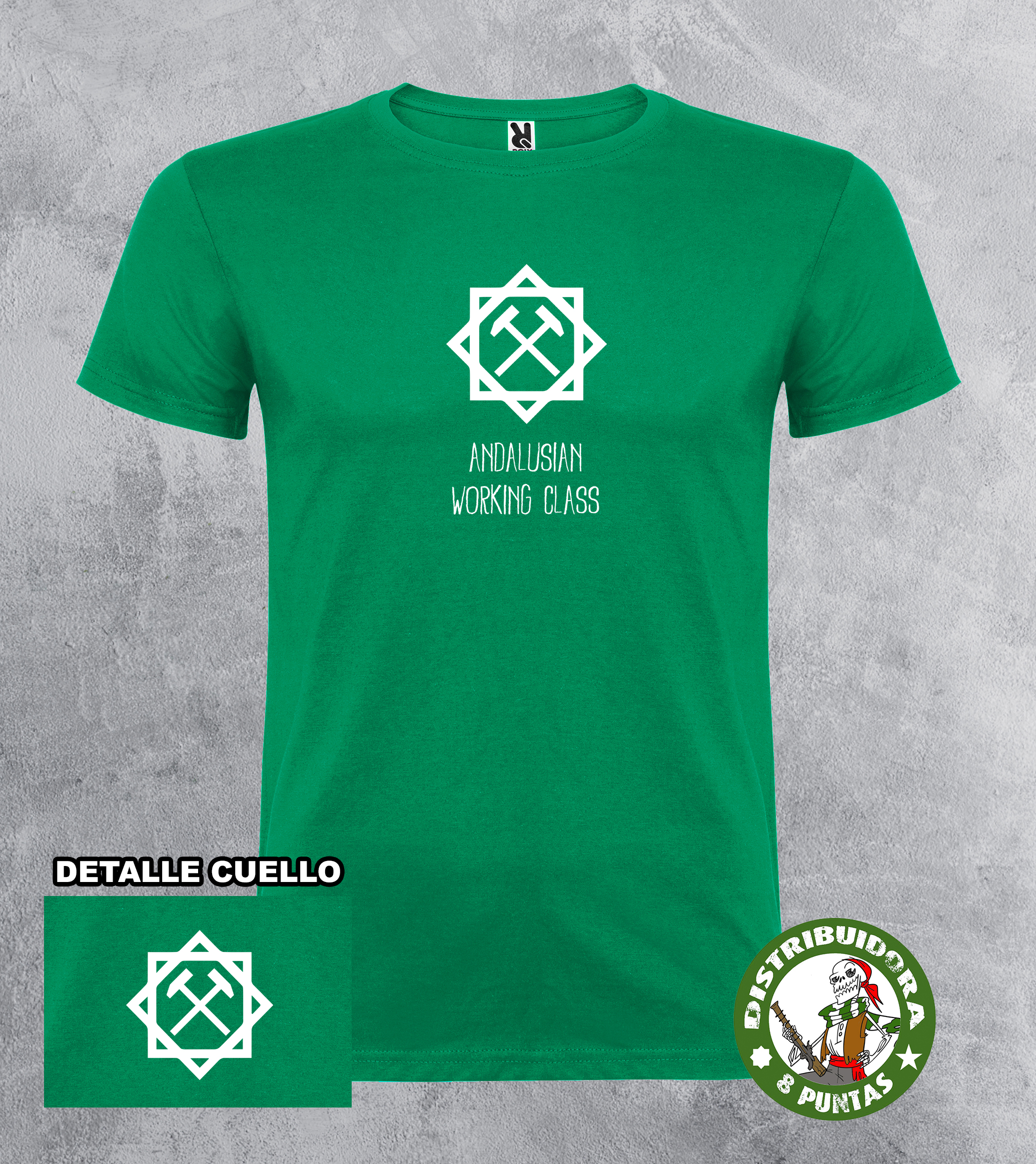 Camiseta de mujer de manga corta. Camiseta andalucista y revolucionaria con el lema «Andalusian working class» (clase trabajadora andaluza) con un dibujo de un gadeiro (estrella de ocho puntas) con dos martillos obreros en su interior, símbolo de la clase trabajadora. Disponible en 4 colores. Gramajes: 100% algodón, punto liso, 170 g/m² modelo estándar. 100% algodón, punto liso, 190 g/m² modelo premium.