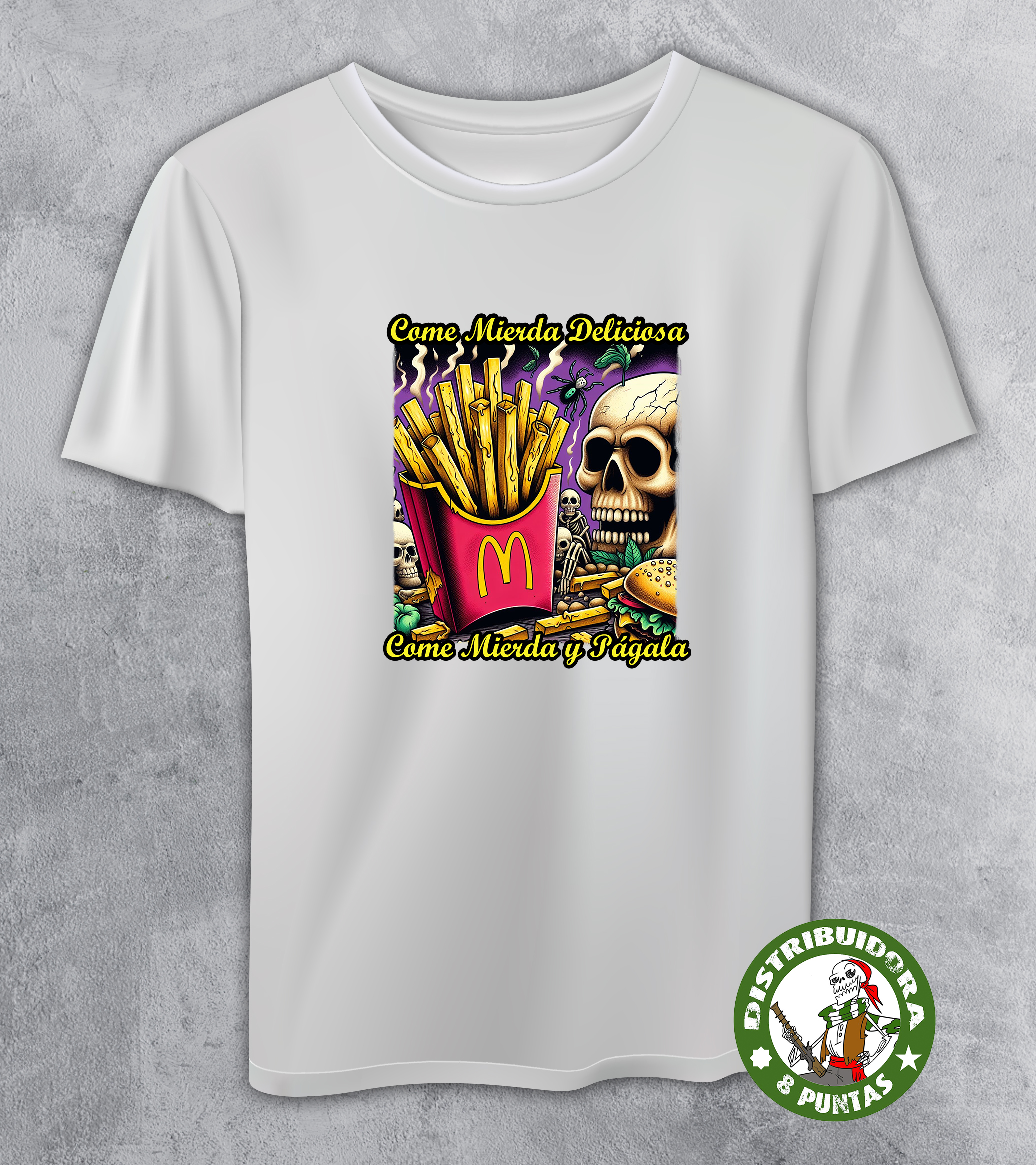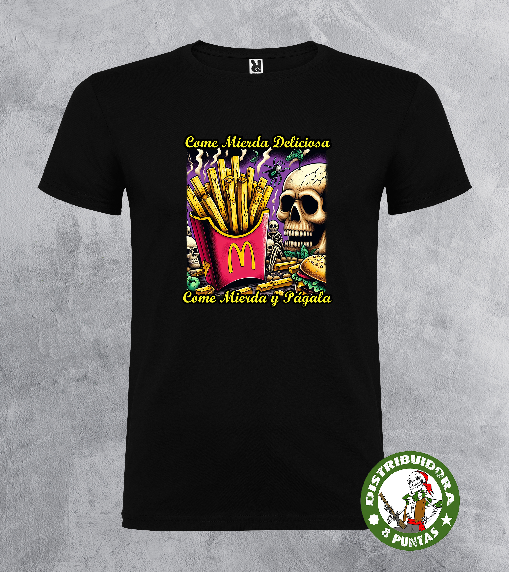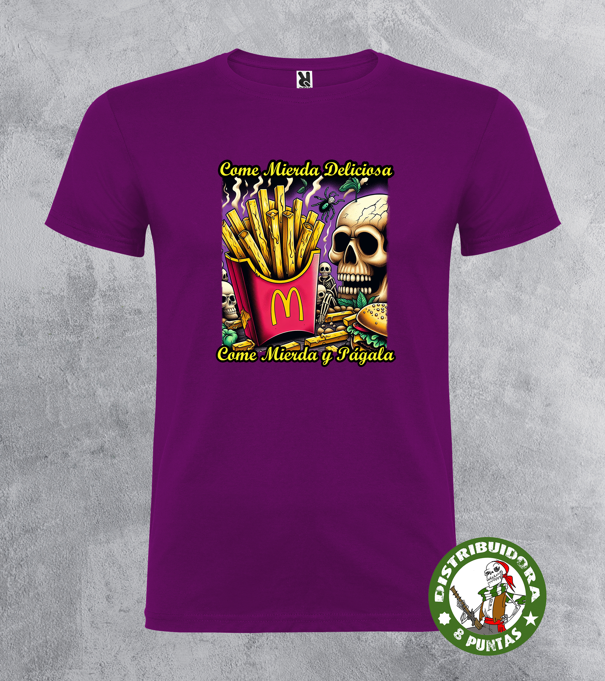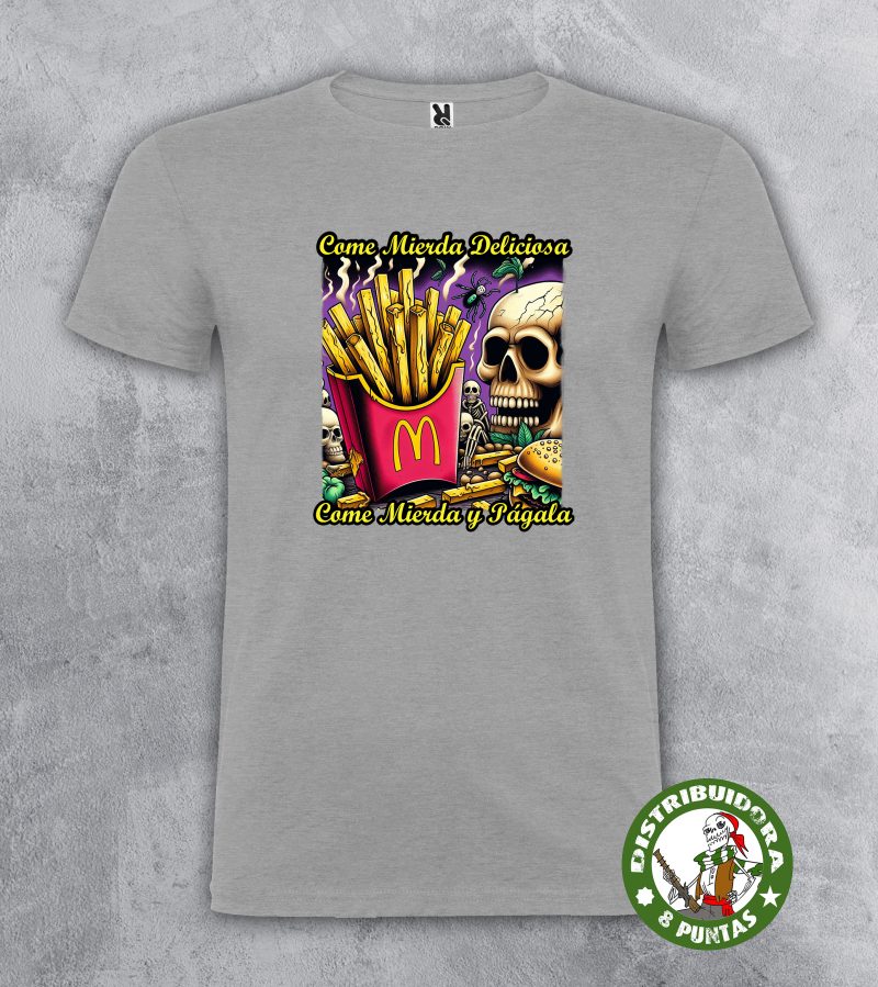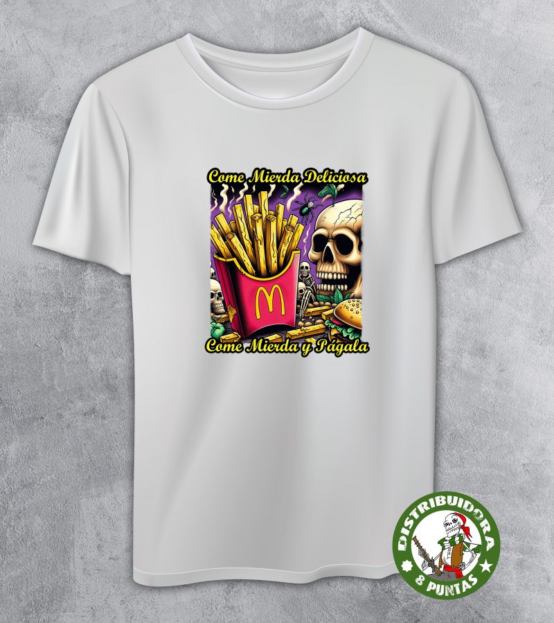 Camiseta de mujer de manga corta. Camiseta andalucista y revolucionaria con una denuncia brutal sobre el veneno que venden las grandes marcas de comida rápida, basada en la conocida canción de La Polla Records «Come mierda». Disponible en 6 colores. Gramajes: 100% algodón, punto liso, 170 g/m² modelo estándar. 100% algodón, punto liso, 190 g/m² modelo premium.