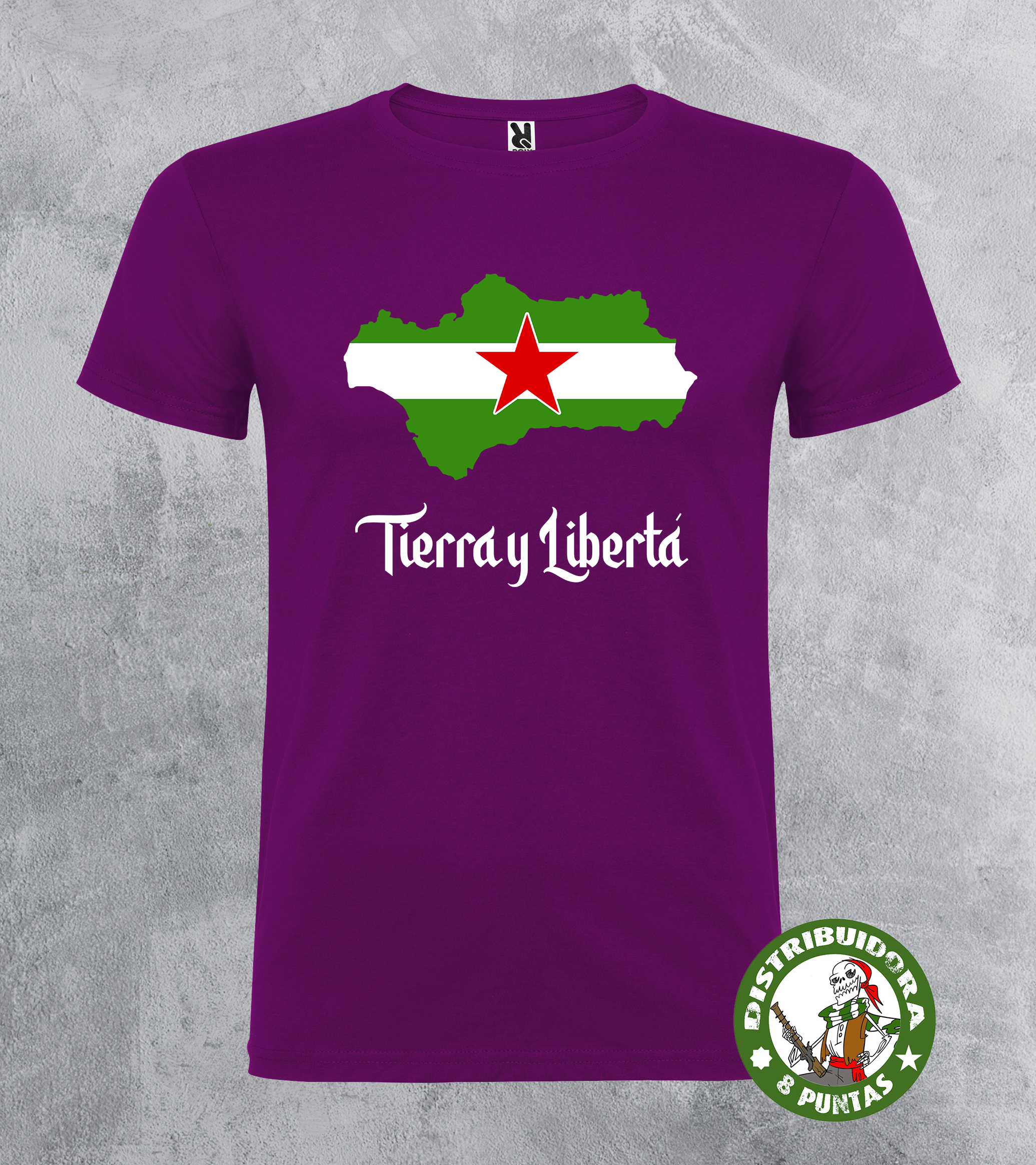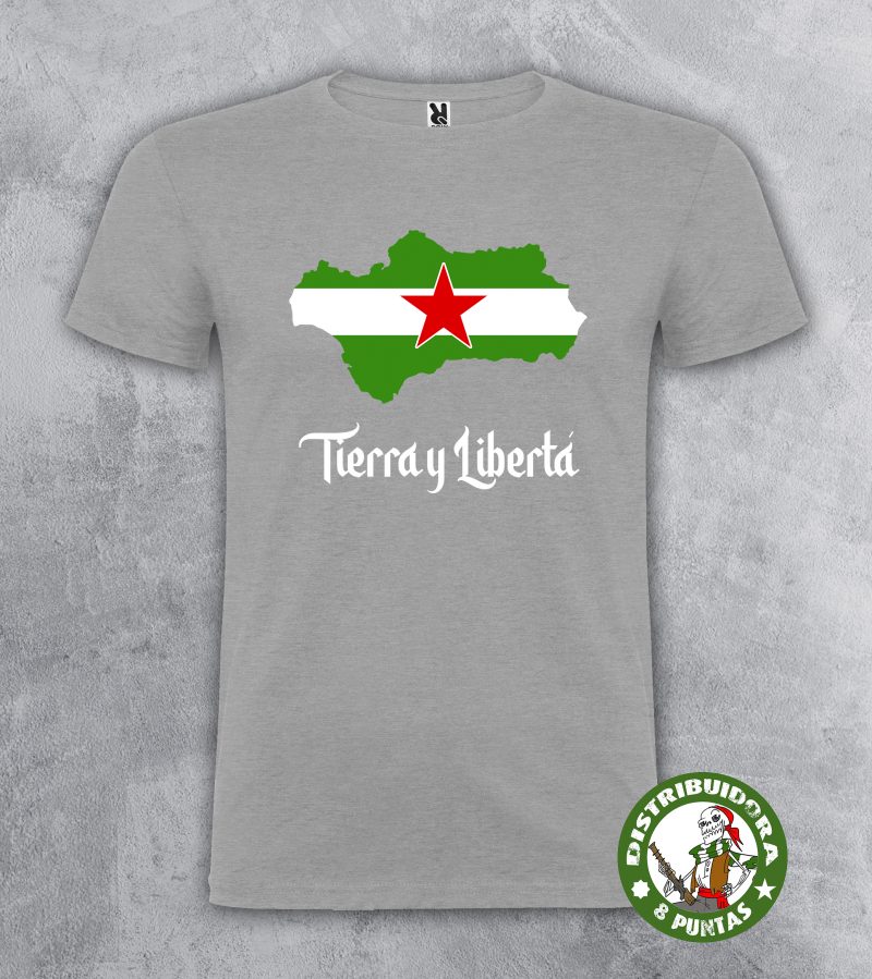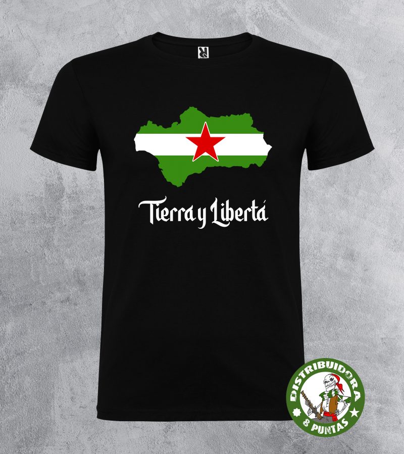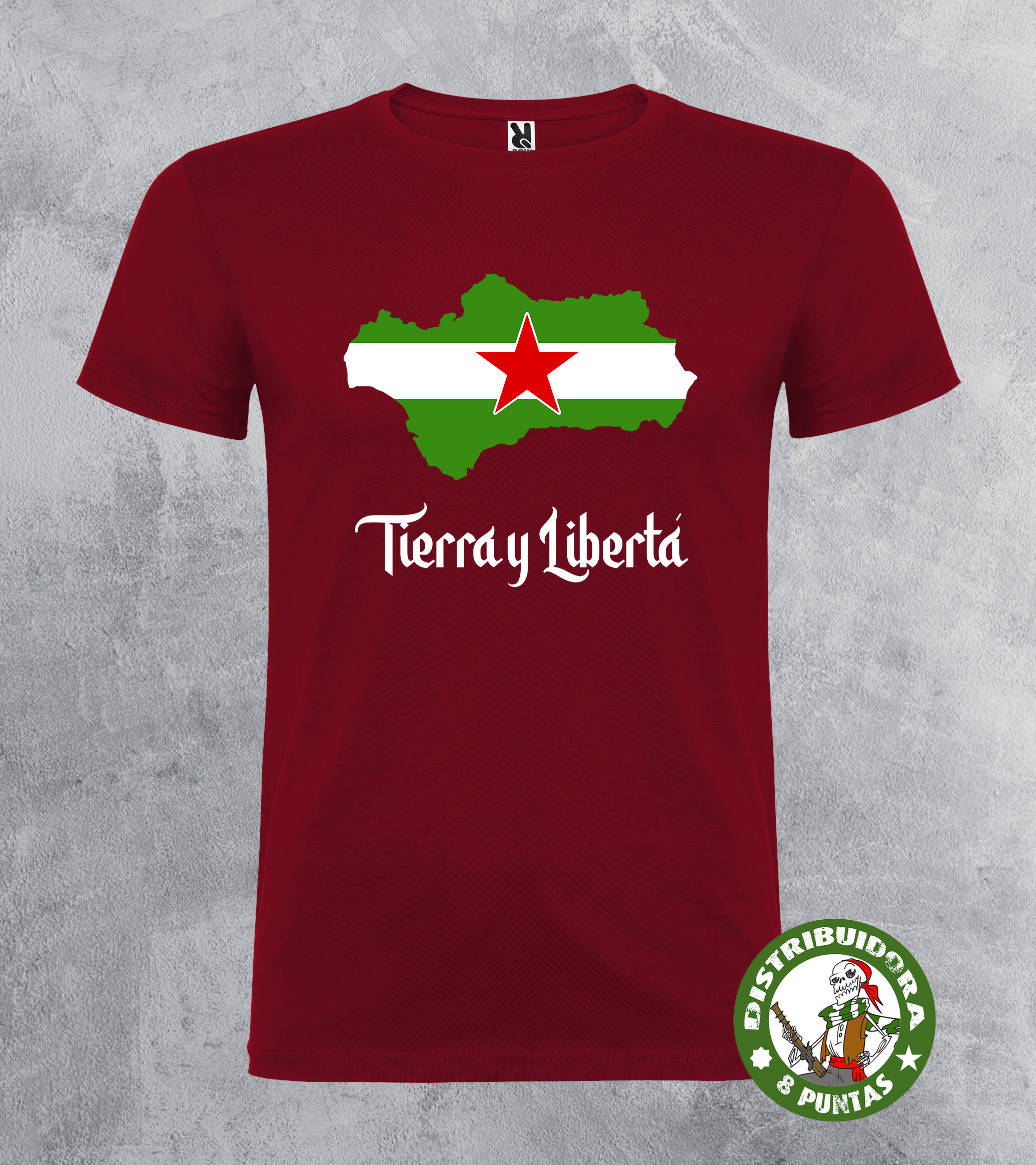 Camiseta de manga corta. 100% algodón, punto liso,160 g/m². Camiseta andalucista reivindicativa con el mapa de Andalucía y la arbonaida con la estrella roja obrera y revolucionaria en su interior y la leyenda revolucionaria «Tierra y Libertad» aparecida en nuestro Himno Nacional.