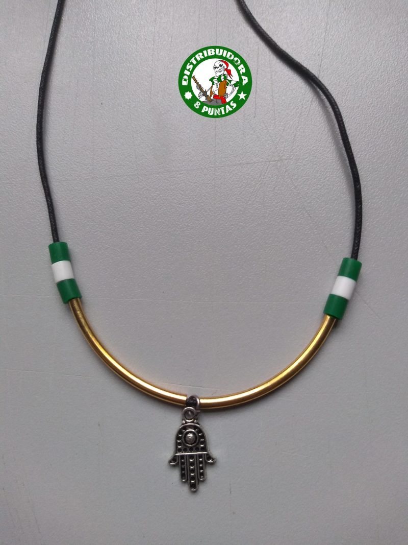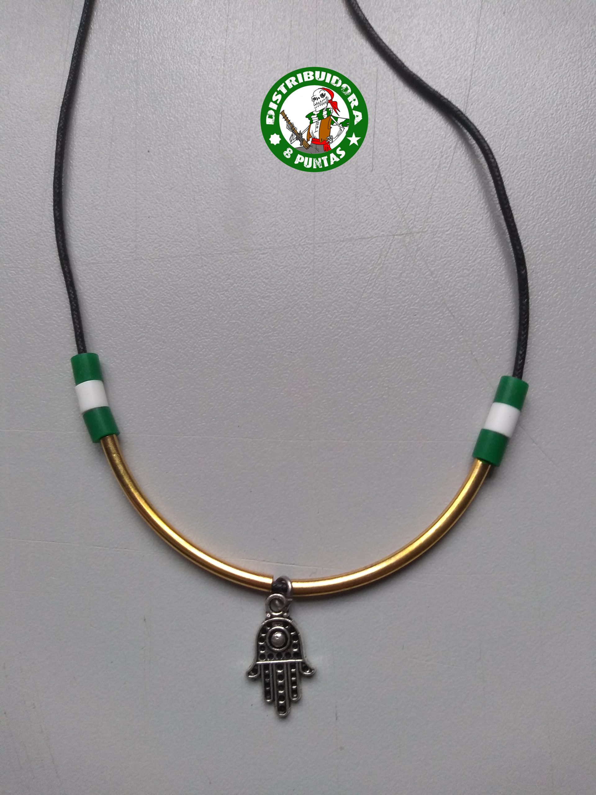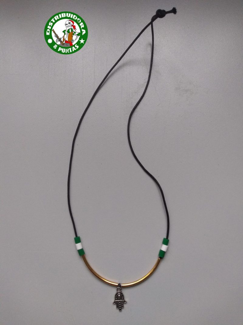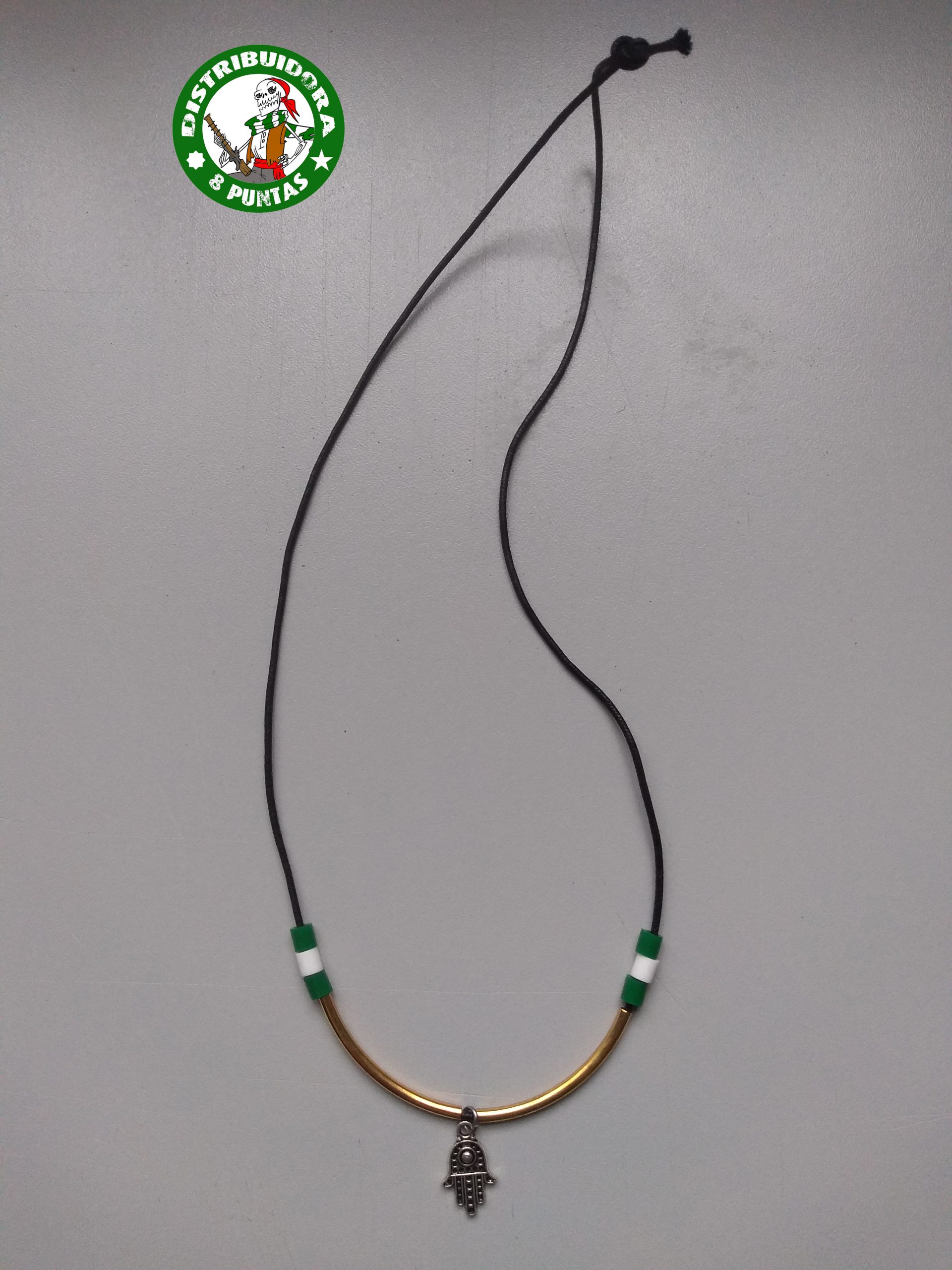 Colgante con Mano de Fátima plateada, abalorios chapados en oro. Abalorios de pvc duro en laterales formando arbonaida. Collar negro encerado.