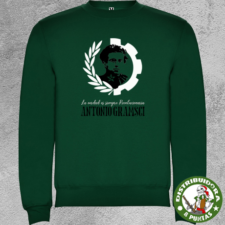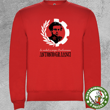 Sudadera en diseño clásico, con cuello, puños y cinturilla de punto canalé. 50% algodón / 50% poliéster, 280 g/m². Para tallas 4XL contacta para consultar colores. Sudadera sin capucha, andalucista, revolucionaria e internacionalista con la efigie de Antonio Gramsci, gran pensador y revolucionario marxista italiano, maltratado brutalmente y asesinado por el fascismo en sus prisiones, con una de sus frases «la verdad es siempre revolucionaria» junto a su nombre. Lo flanquean una corona de laurel y una rueda dentada obrera.