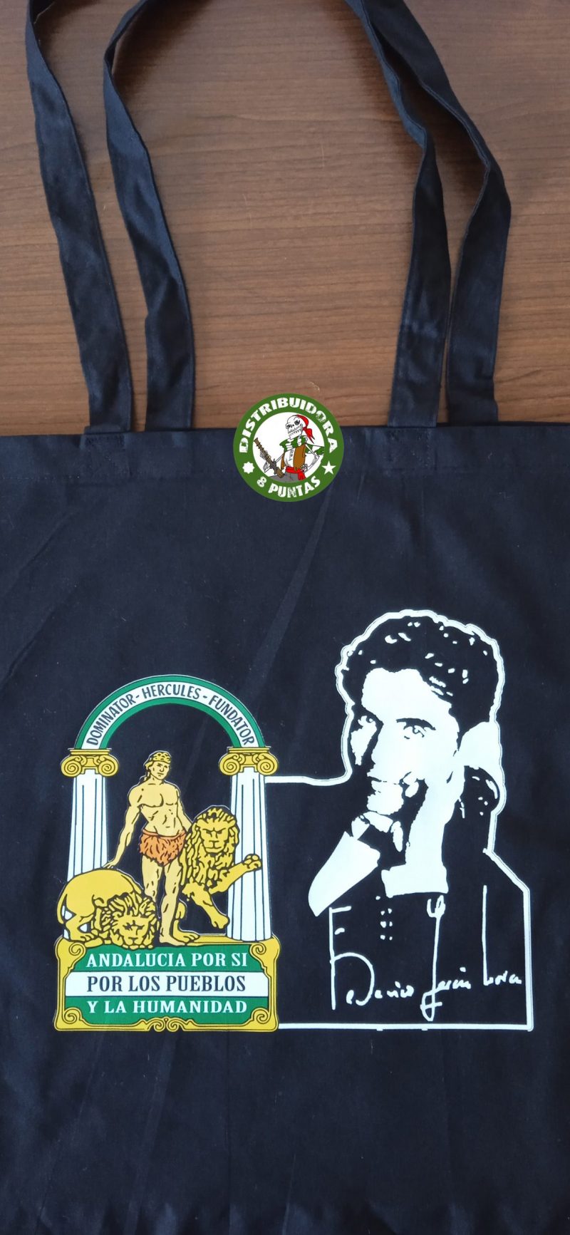 Bolsa con la efigie de Federico García Lorca junto al Escudo de Andalucía con el lema «Por los Pueblos». Fabricada en tejido de algodón en color negro, con asa larga de cinta en el mismo color. Medidas: 37 x 41 cm.  Medida del asa: 70 cm